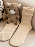 These novelty crew socks feature a three-dimensional, crocheted highland cow plush figure attached to the front. Designed for indoor comfort, the socks utilize a ribbed knit structure for a secure fit. The brown and beige color palette offers a warm, neutral aesthetic suitable for casual loungewear.