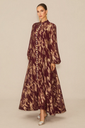 Elevate your wardrobe with the Aitana Metallic Print Puff Sleeve Maxi Dress. Featuring a versatile two-way design and an included belt, seamlessly switch between an A-line or tent silhouette. Available in brown, sizes XL and XXL.