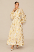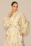 Shimmer Metallic Print, Button Front, Long Puff Sleeves, Stand Collar, Maxi Length.