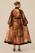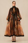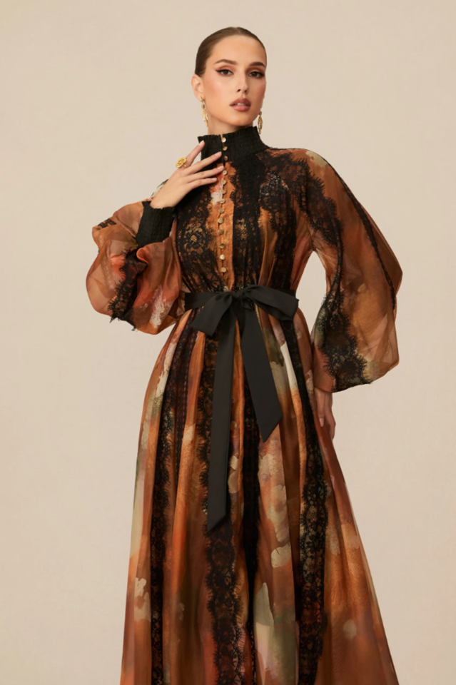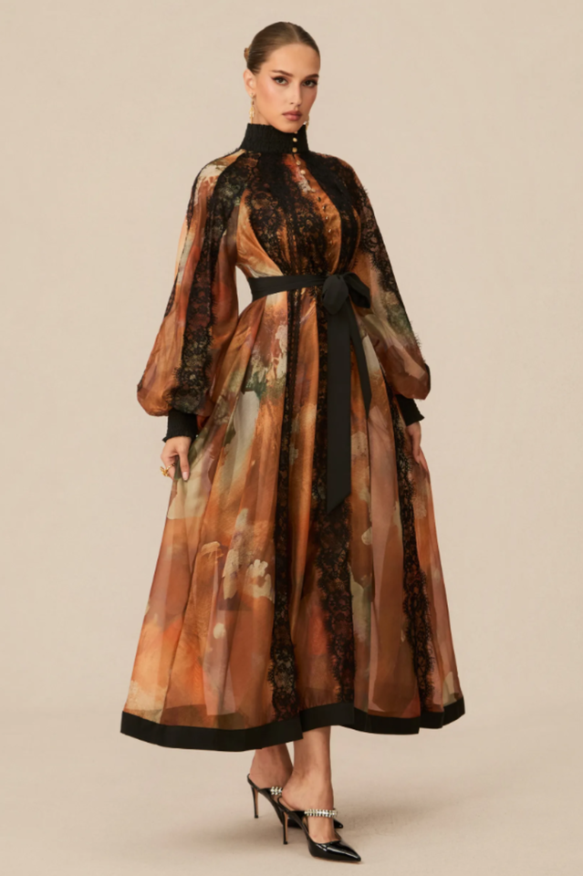 Abstract Print, Mock Neck, Balloon Sleeves, Tie Belt Waist, Sheer Overlay, Lace Splicing Design, Midi Length.