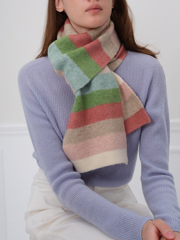 Brighten up your cold-weather looks with the subtle sweetness of our Soft Arctic Velvet Rainbow Scarf. Inspired by the gentle Korean "Ins" Style and Soft Girl aesthetics, this accessory features a delightful array of candy-colored stripes—blending muted blues, reds, pinks, and greens for a look that is colorful yet sophisticated.