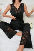 Black Lace Trim Pajama Set, V-Neck Sleeveless Top & Wide Leg Pants - Elegant Sleepwear