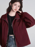 Embrace the retro streetwear vibe with this burgundy utility windbreaker. Featuring a relaxed, oversized silhouette and a classic stand collar, this lightweight jacket is designed for layering. The minimalist chest embroidery and elastic cuffs add a functional yet stylish touch to your casual rotation.