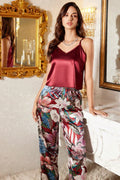 Burgundy Satin Cami Set with Tropical Floral Pants, 2-Piece Silky Sleepwear - Mother's Day Gift