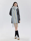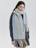 Bring a touch of golden hour glow to your winter wardrobe with this Butter Yellow Striped Wool Scarf. Featuring a gentle, hazy stripe pattern in soft yellow, dove grey, and cream, this scarf captures the cozy essence of the "Scandi Pastel" and "Soft Girl" aesthetics. It looks absolutely dreamy paired with a white puffer jacket or a beige wool coat.