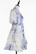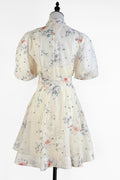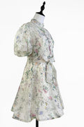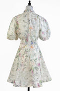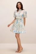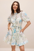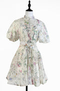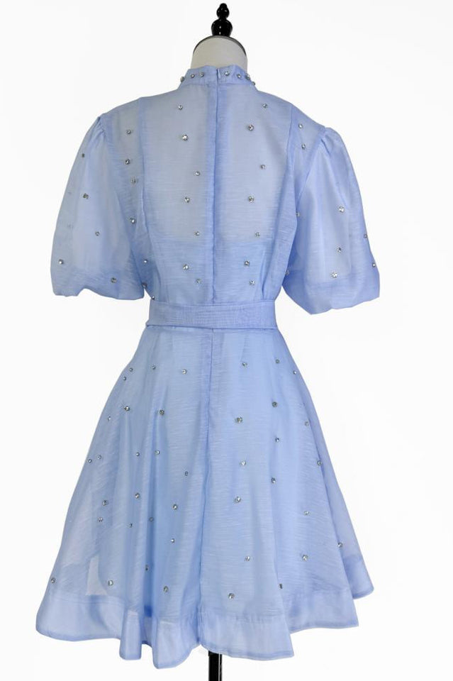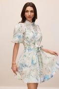 Crystal Embellishment, High Neck, Short Puff Sleeves, Side pockets, Tied Waist, All-over Floral Print, Mini Length.