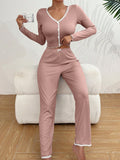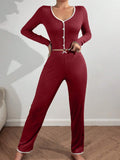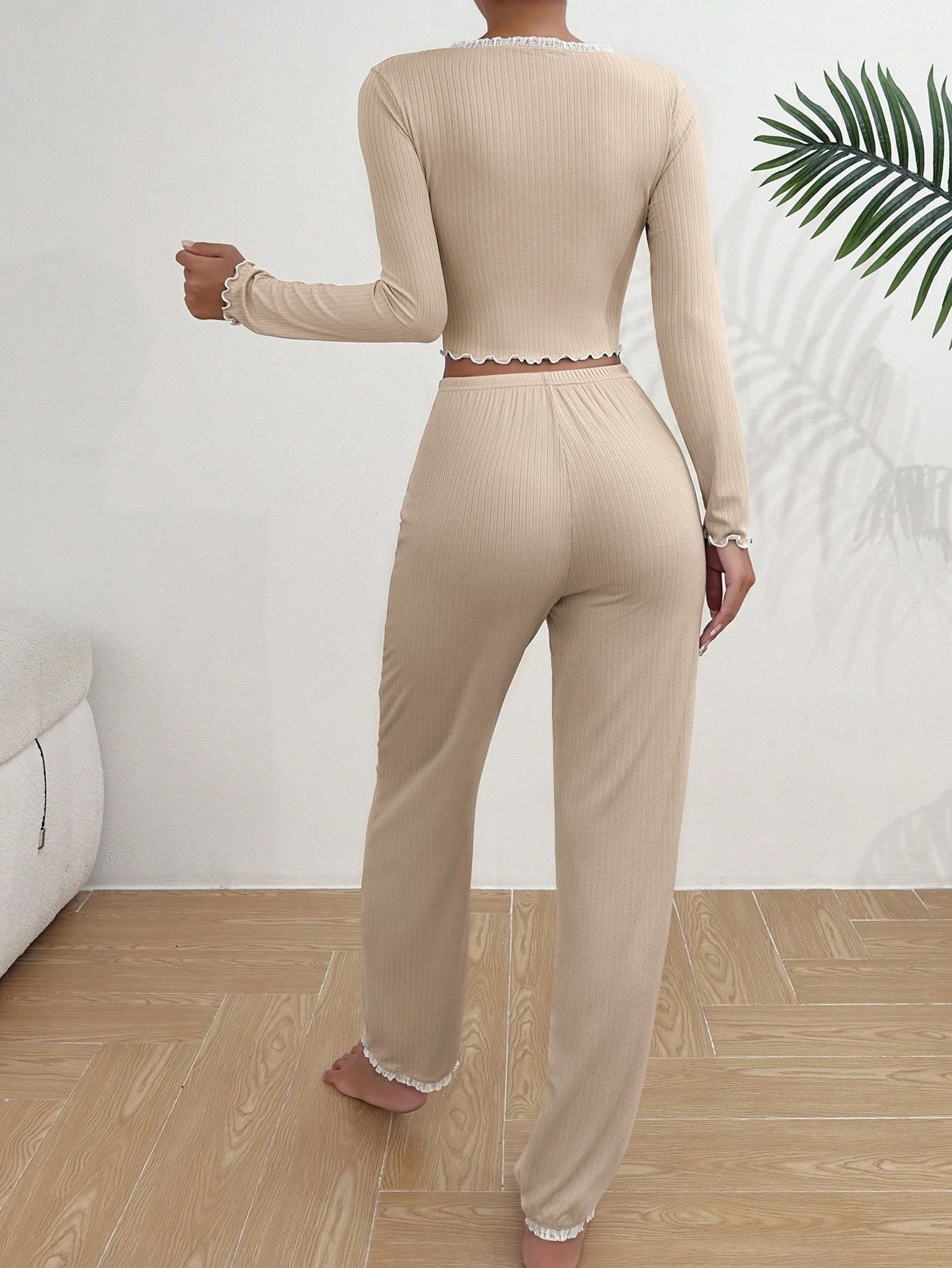Step into a world of soft romance and cozy elegance with our Coquette Baby Blue Ribbed Knit Pajama Set. This dreamy two-piece ensemble features a figure-hugging, long-sleeve crop top with a delicate white lace-trimmed V-neckline and charming button-front details. The lettuce-edge hems on the sleeves and waist add a playful, feminine touch synonymous with the trending coquette aesthetic. Paired with matching high-waisted pants that feature a sweet mini bow at the elastic waistband, this set is crafted from a premium high-stretch ribbed knit that sculpts your silhouette while providing cloud-like comfort. It's the perfect blend of sexy and sweet for your nightly routine or lazy weekend mornings.