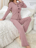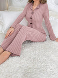 Channel the timeless elegance of the "Old Money" aesthetic with our Coquette Contrast Trim Ribbed Pajama Set. This sophisticated two-piece ensemble features a chic apricot beige ribbed knit accented with striking black contrast lettuce-edge trim, creating a refined, vintage-inspired look. The top is designed with a flattering V-neckline, three elegant black satin bows, and graceful bell sleeves that add a touch of drama to your movements. Paired with matching loose-fit trousers that drape beautifully, this set offers the perfect balance of Parisian charm and cozy comfort for your lounging hours.