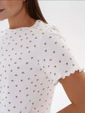 Sweeten your sleepwear rotation with our Coquette Ditsy Heart Print Ribbed Tee & Shorts Set. This adorable two-piece ensemble perfectly captures the viral "soft girl" aesthetic with its dainty red heart pattern scattered across a crisp white ribbed knit. The set features a playful short-sleeve crop top with a classic round neckline, paired with matching mini shorts. Both pieces are finished with whimsical red lettuce-edge trimming (wavy hem), adding a flirtatious and romantic touch. Crafted from a soft, stretchy fabric that mimics the cozy feel of cotton, this set is lightweight, breathable, and perfect for warm summer nights or cute slumber parties.