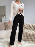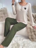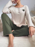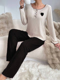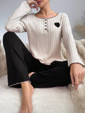 Snuggle up in style with our Coquette Heart Patch Ribbed Lounge Set. This adorable two-piece ensemble features a creamy beige ribbed top accented with a fuzzy red heart patch on the chest and playful red lettuce-edge trim. The top is designed in a classic henley style with three functional buttons, adding a touch of rustic charm. Paired with contrasting deep burgundy ribbed trousers, this set offers a warm, "velvet-soft" touch perfect for chilly autumn and winter evenings. Whether you're lounging by the fire or enjoying a slow weekend morning, this set blends comfort with a trendy, romantic aesthetic.