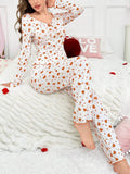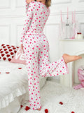 Fall in love with your loungewear collection all over again with our Coquette Heart Print Ribbed Pajama Set. This darling two-piece ensemble features a romantic all-over red heart print on a soft, white ribbed knit canvas. The top is designed with a flattering V-neckline and a gathered, ruched bust that enhances your silhouette, finished with a dainty red satin bow. Playful red lettuce-edge trimming along the hems and cuffs adds a whimsical, vintage-inspired touch. Whether for a cozy Valentine's night or sweet dreams year-round, this set blends comfort with undeniable cuteness.