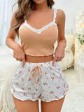 - Ditsy Floral Shorts: The bottoms feature a fresh pink floral pattern on a white background with a decorative drawstring tie.