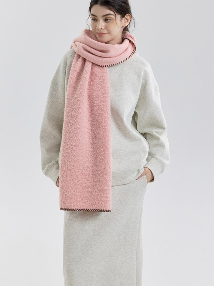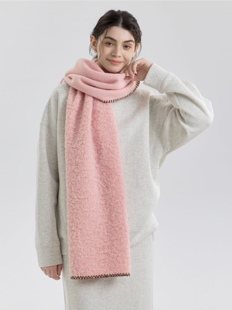 Featuring a delicate Soft Pink hue, this piece perfectly captures the Soft Girl and Comfy Chic aesthetic. The edges are finished with a charming contrast blanket stitch, adding a vintage-inspired detail that elevates it from a simple accessory to a statement piece. With 6% wool content, it provides the perfect balance of breathability and thermal insulation without the heaviness.