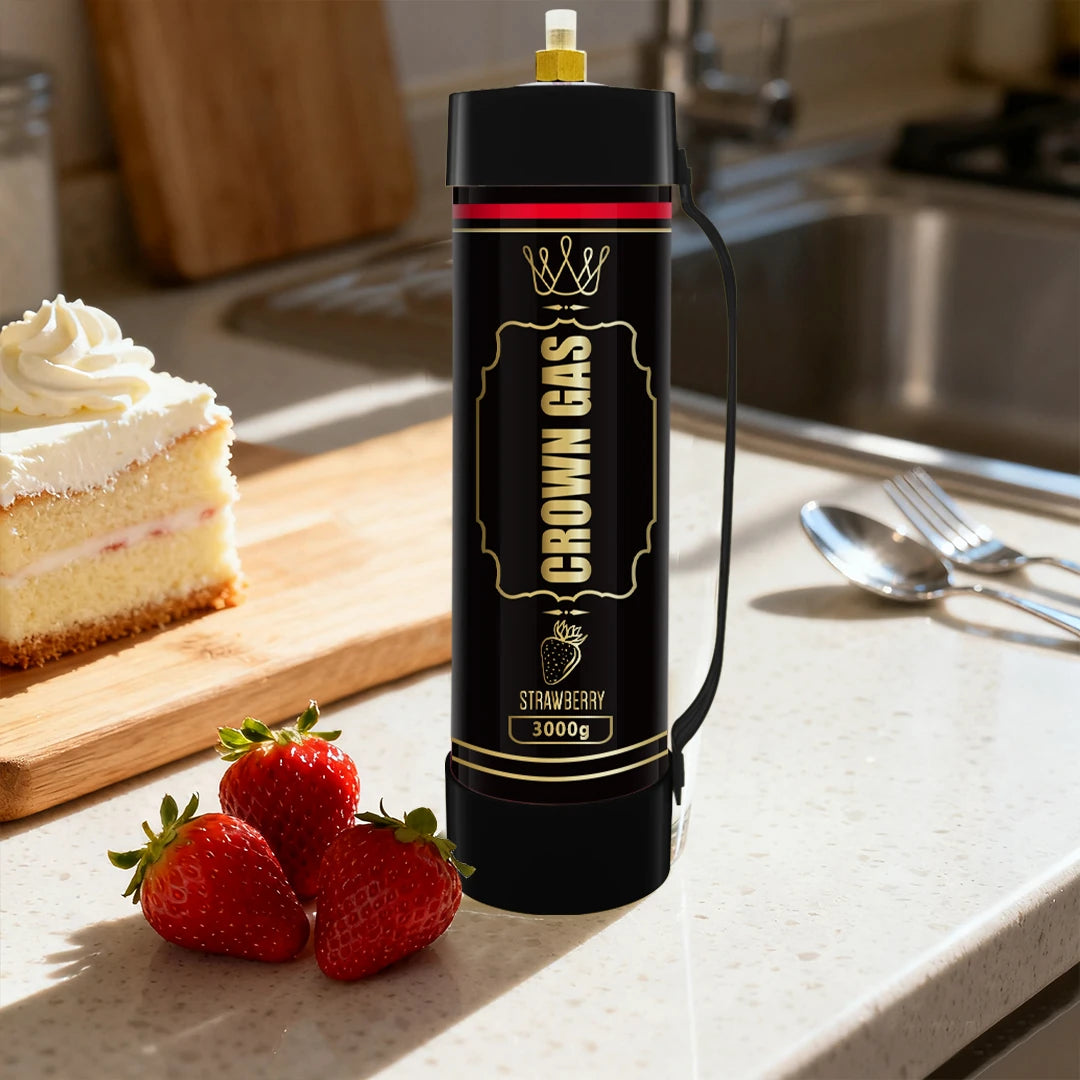 The Crown Gas whipped cream tank features a massive 3000g capacity, made from high-quality stainless steel to ensure durability and reliability for heavy-duty usage.