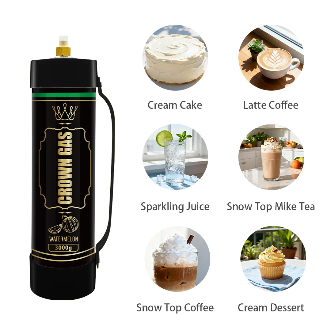 The Crown Gas whipped cream tank features a massive 3000g capacity, made from high-quality stainless steel to ensure durability and reliability for heavy-duty usage.