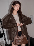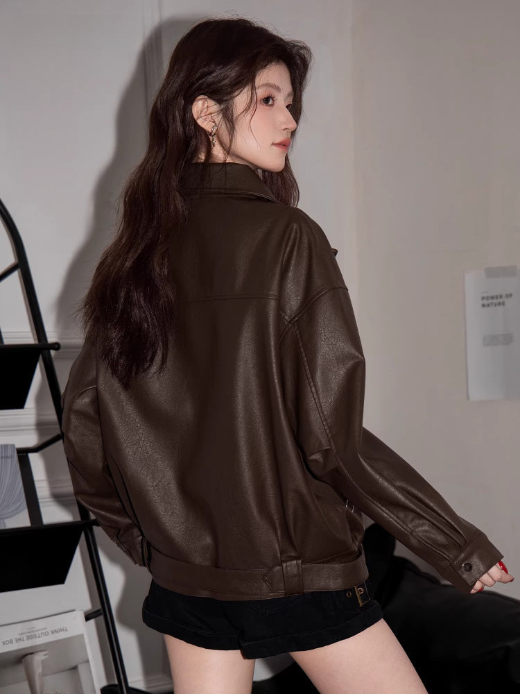 Capture the trending espresso aesthetic with this dark brown oversized moto jacket. Crafted from high-quality faux leather (PU), this piece features a relaxed, drop-shoulder silhouette that channels vintage 90s vibes. Finished with a belted hem and silver-tone hardware, it’s the ultimate cool-girl layer for transitional weather.