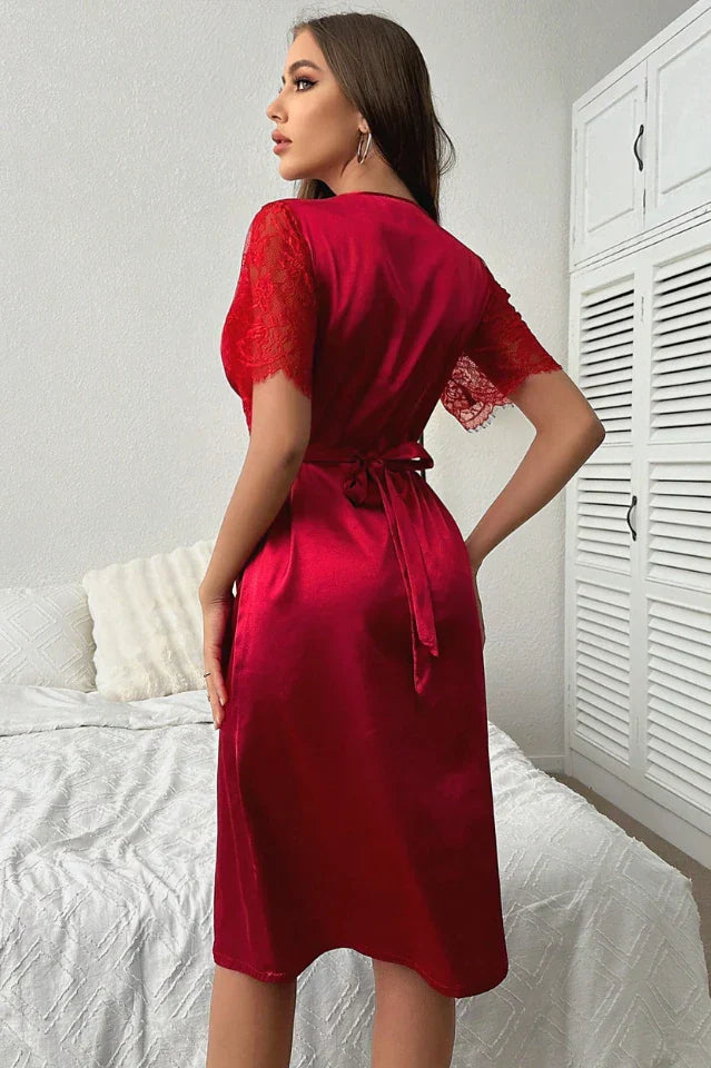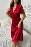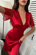 Dark Red Satin Nightgown with Lace Sleeves & Waist Tie, V-Neck Midi Sleep Dress - Elegant Loungewear