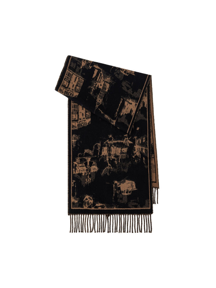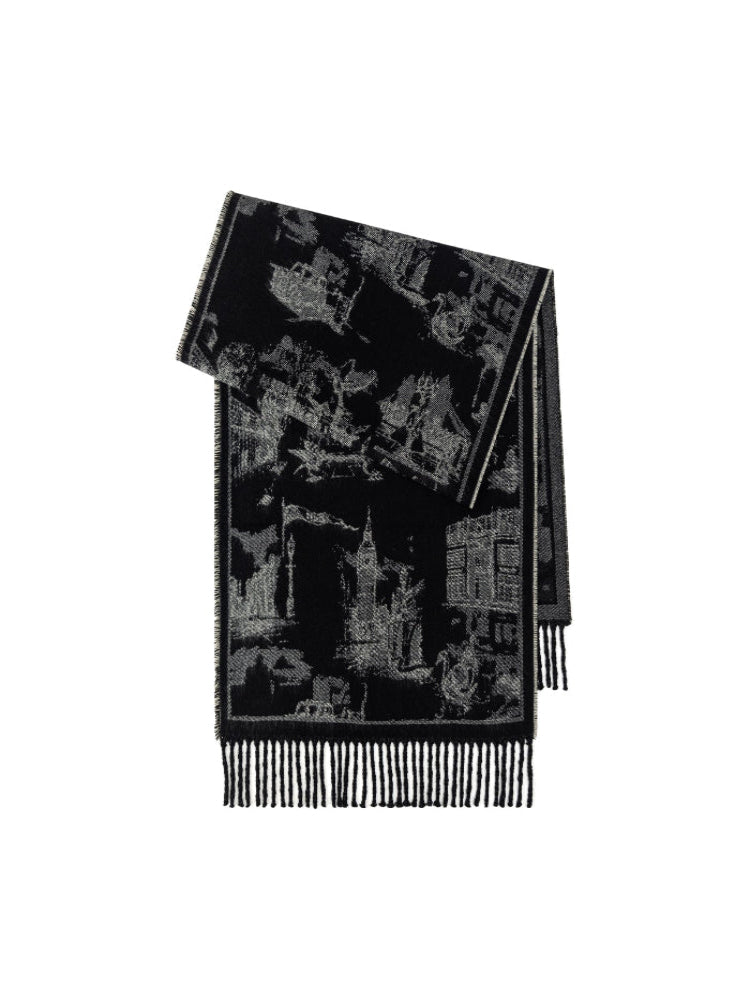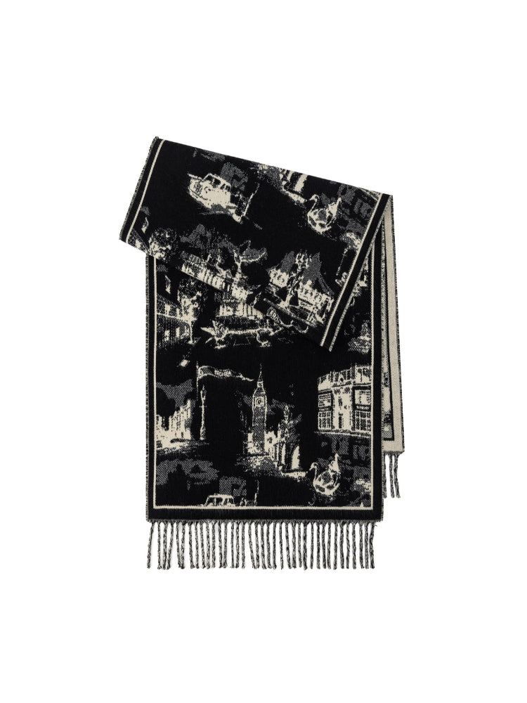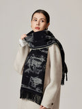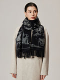 Featuring a striking abstract graphic pattern in a monochrome black and grey palette, it adds an instant 'cool factor' to any outfit. The specialized "imitation cashmere" weave creates a dense, thickened fabric that provides substantial warmth—perfect for battling winter winds or staying cozy in air-conditioned workspaces.