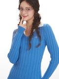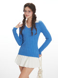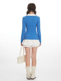 This vibrant blue pullover features a classic cable knit texture that hugs your silhouette for a flattering, slim fit. The standout feature is the crisp white shirt collar insert, creating a smart, faux two-piece look that transitions seamlessly from library study sessions to brunch dates. Finished with a delicate pink "N" script embroidery on the chest, it adds a personalized, varsity-inspired touch to your outfit. Pair it with a white pleated mini skirt and leg warmers to complete the ultimate Y2K schoolgirl ensemble.
