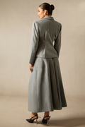 Power Suit, Long Sleeves, Voluminous Shoulders, Darted Waistline, Pleated A-line Skirt.