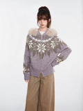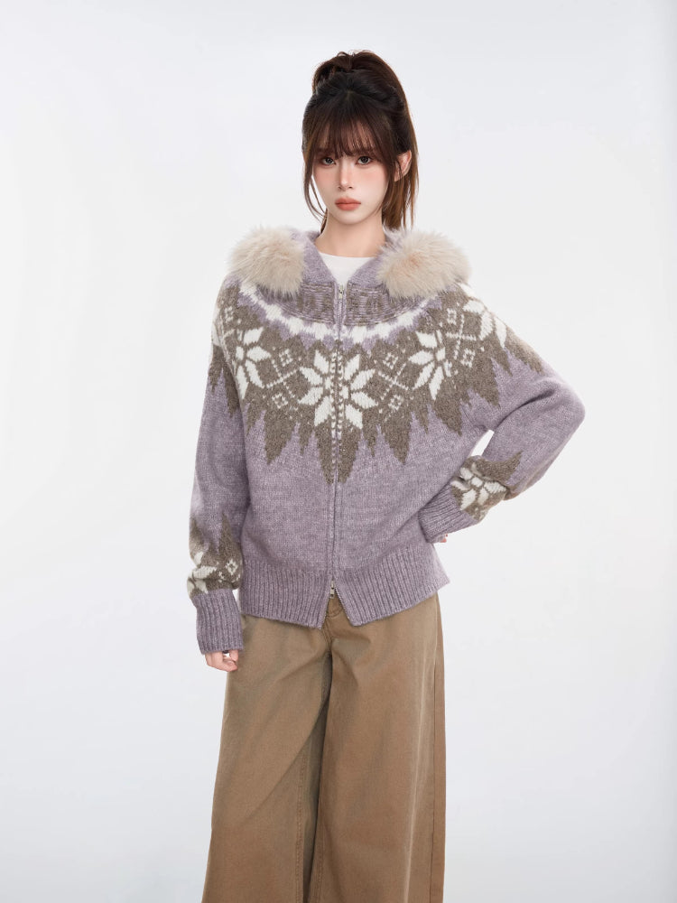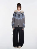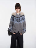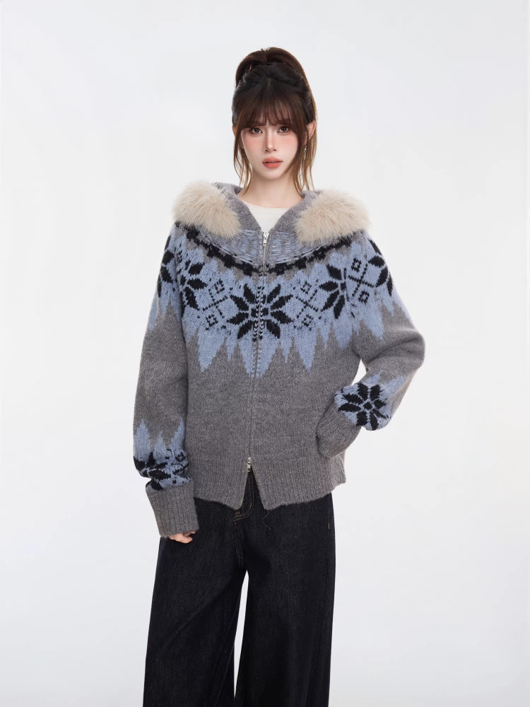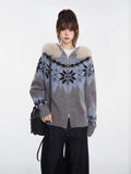 Embrace the winter season with this cozy grey knit cardigan, featuring a classic Nordic Fair Isle pattern in cool blue tones. This "thickened" sweater jacket is designed with a luxurious faux fur trim hood and a practical two-way zipper, offering both warmth and versatile styling options. Its relaxed fit and raglan sleeves make it an ideal outer layer for chilly days.