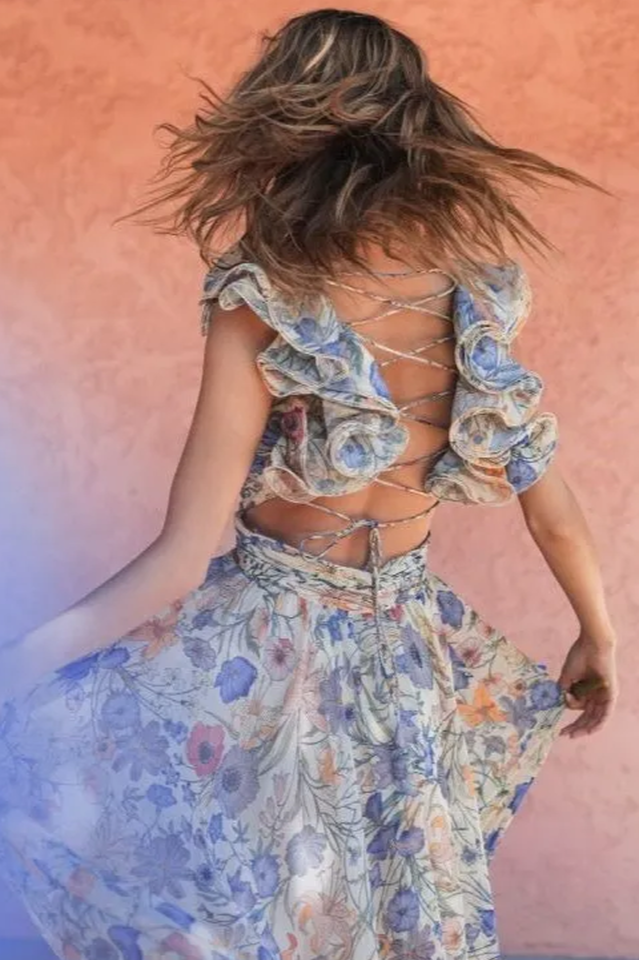 Designed in airy chiffon with ruffle accents and a lace-up back, the Marissa maxi exudes romantic elegance. Perfect as a garden wedding guest dress, it flatters with a deep V-neckline and soft draping. This chiffon maxi dress balances comfort and sophistication, making it a timeless choice for weddings, vacations, and evening celebrations.