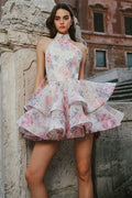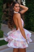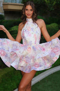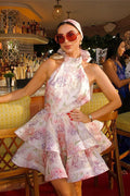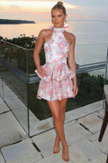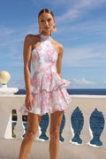 The Marissa Oversized Bow Tiered Mini Dress showcases a charming floral print, stand collar, and elegant oversized bow. Its backless, sleeveless design and tiered mini-length skirt in pink create a feminine, standout look perfect for special occasions.