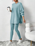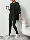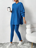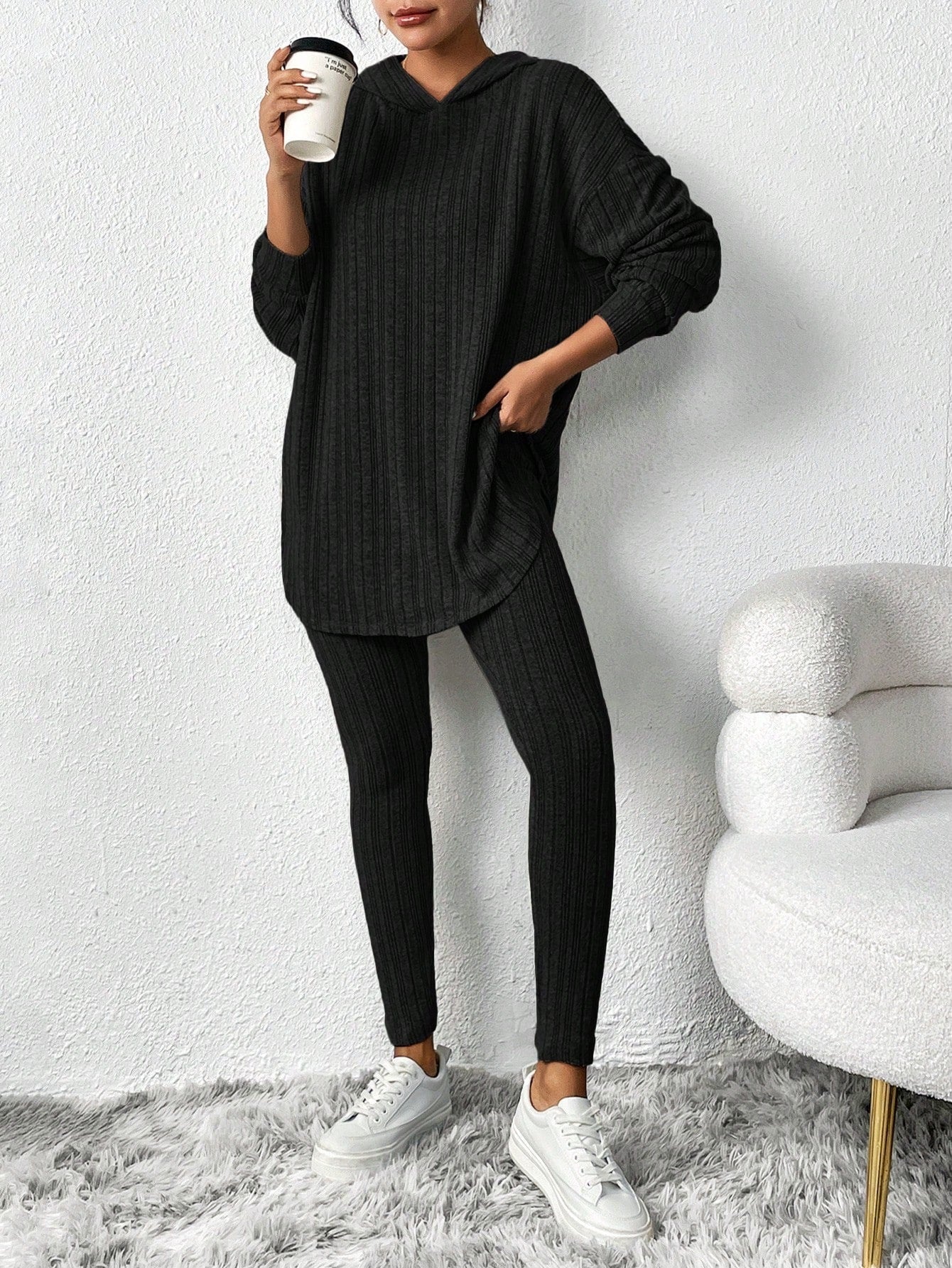 The set features an oversized, tunic-length hoodie that envelopes you in warmth, offering a relaxed silhouette that covers the hips for ultimate comfort. Paired with matching fitted leggings, the look creates a flattering contrast of proportions—loose on top, streamlined on the bottom. Crafted from a stretchy, vertical ribbed knit, this monochromatic set is your go-to for travel days, coffee runs, or curling up with a good book.