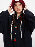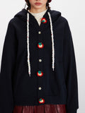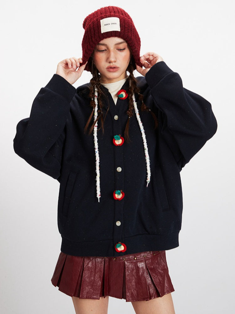 The deep navy fabric is flecked with colorful "confetti" neps, creating a textured, vintage look. But the real showstoppers are the adorable, hand-stitched 3D apple buttons—complete with tiny green leaves—running down the front. Paired with textured, colorful drawstrings, this oversized jacket is as comfortable as it is cute, making it the perfect conversation starter for casual outings or cozy reading sessions.