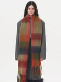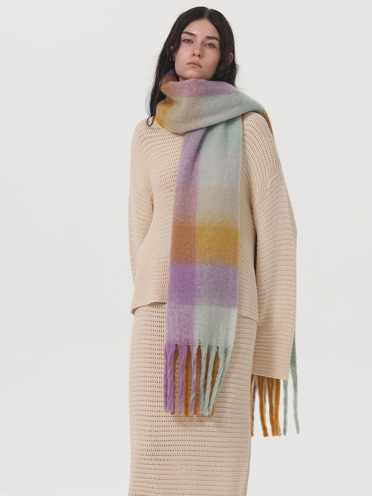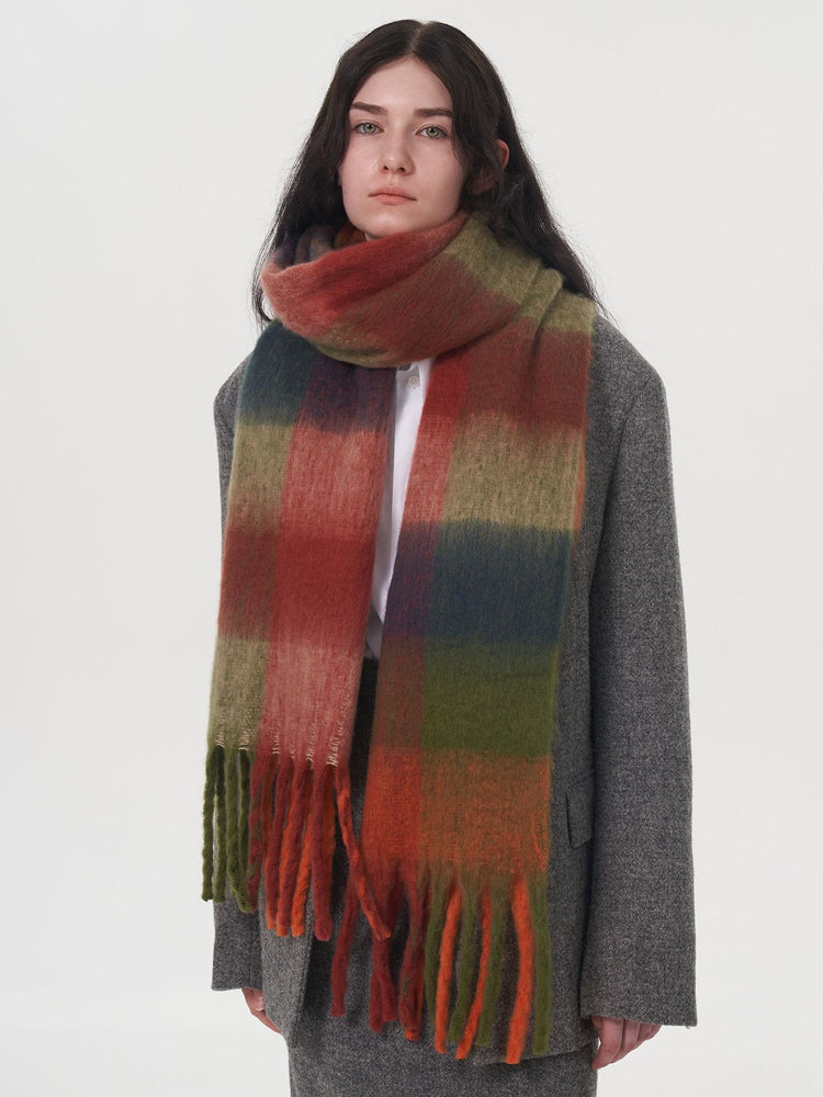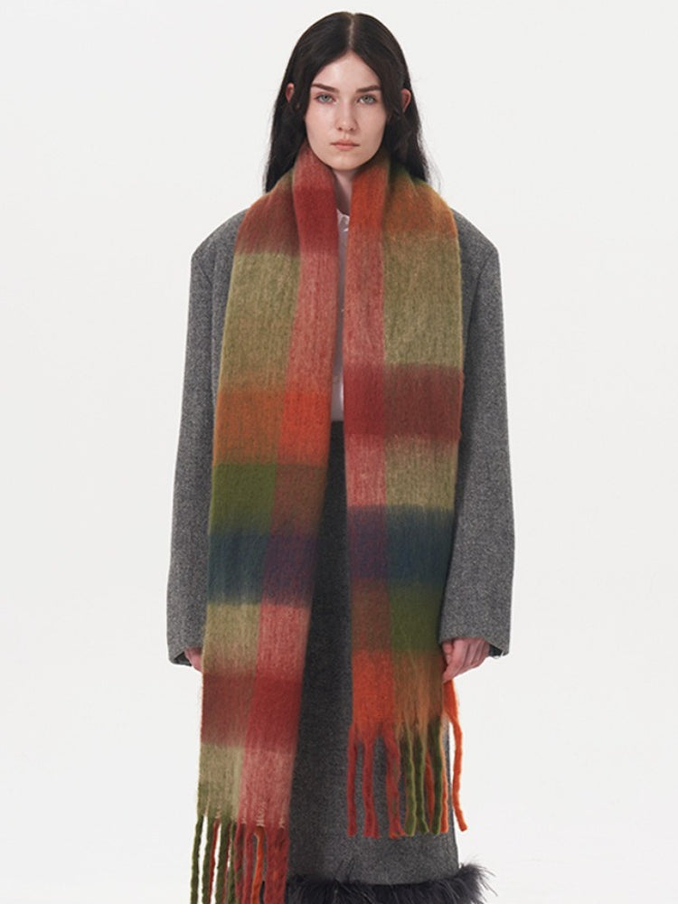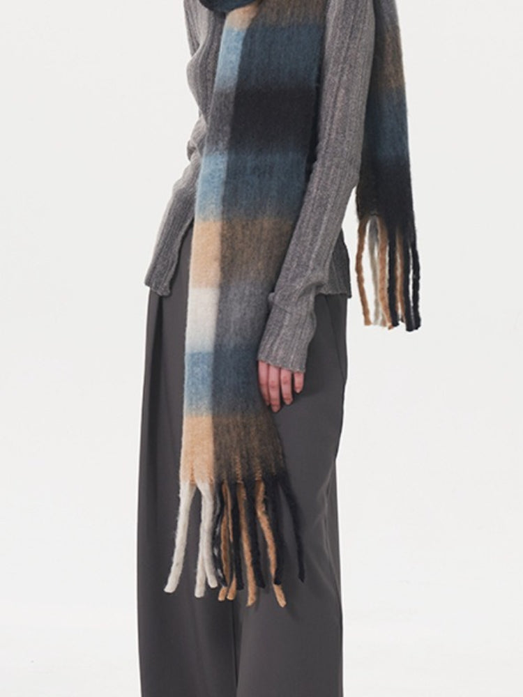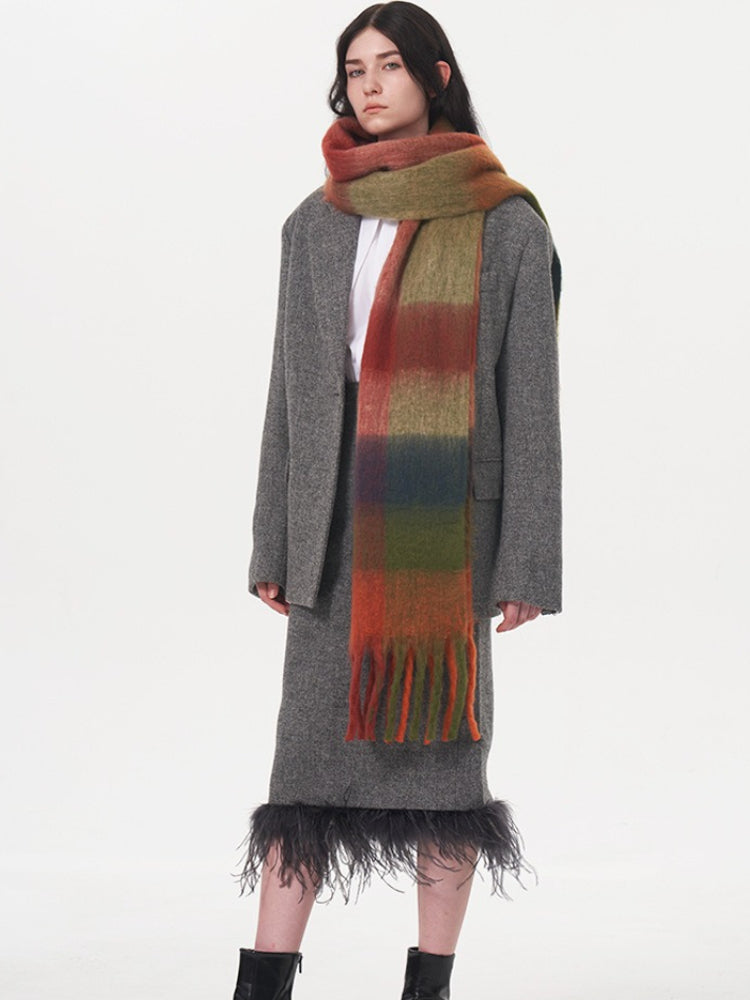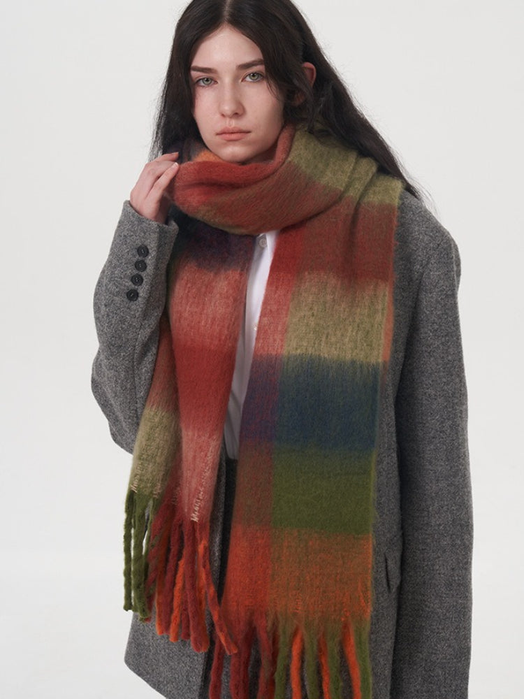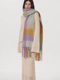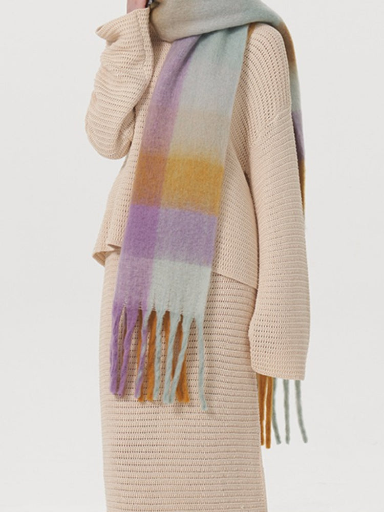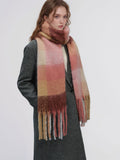 This is one of the longest scarves in our collection, boasting an impressive length of **96.5 inches (245cm)**. This extreme length allows for dramatic styling—wrap it three times for a chunky, wind-proof cowl or let it hang loose to showcase the beautiful gradient blocks. Crafted from high-density, soft-touch polyester, it weighs approx. **9.6 oz (273g)**, offering substantial warmth that rivals wool.