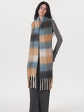 Wrap yourself in the calming hues of winter with this **Oversized Blue & Beige Color Block Plaid Scarf**. Featuring a sophisticated mix of warm camel, soft sky blue, creamy white, and charcoal grey, this scarf offers a "Rainbow" of earth tones that fits perfectly into a "Scandi Minimalist" wardrobe.