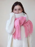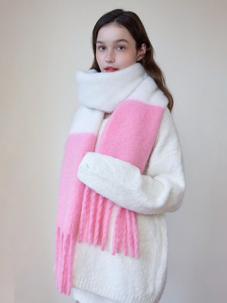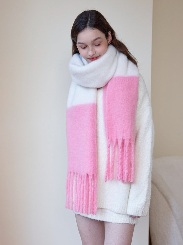 Infuse your cold-weather wardrobe with a playful touch of romance using our Oversized Candy Pink & White Scarf. Perfectly aligned with the trending 'Soft Girl' and 'Coquette' aesthetics, this accessory features a dreamy two-tone color block design that mimics a dipped-in-candy look.