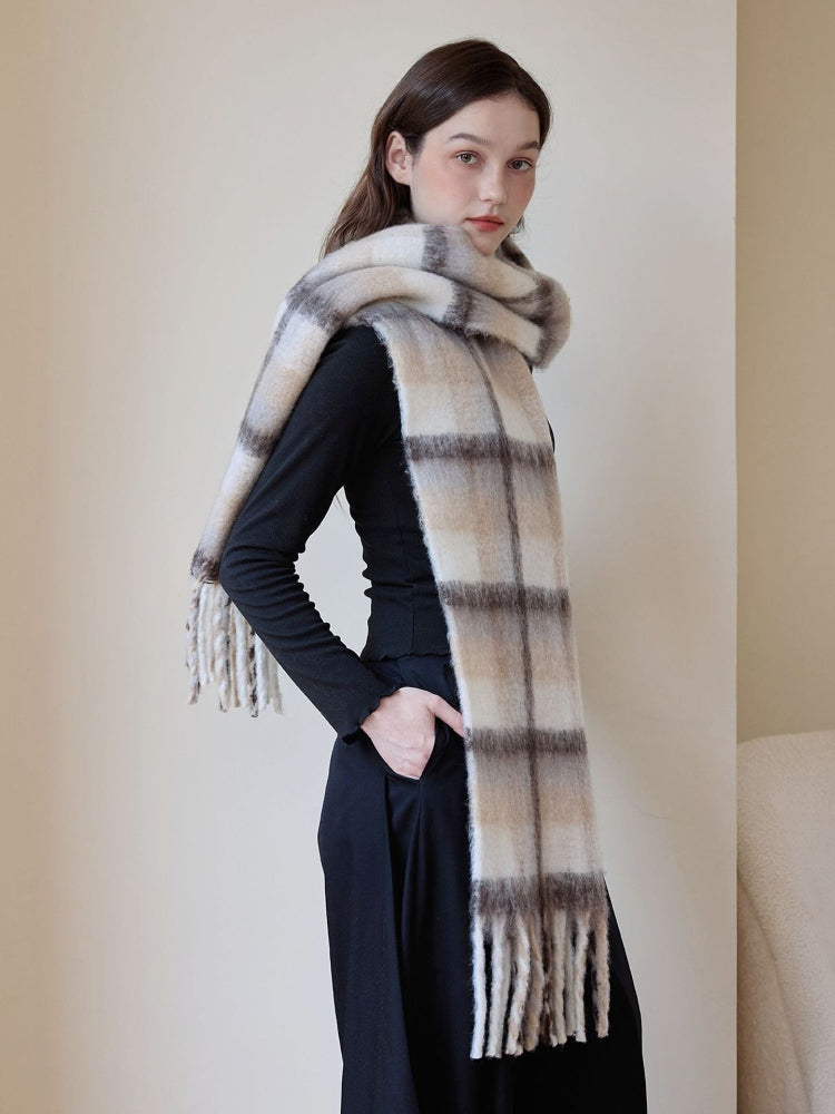 Wrap yourself in the ultimate winter embrace with our Oversized Faux Mohair Plaid Scarf. Capturing the essence of the 'Comfy Chic' aesthetic, this accessory features a brushed "mohair-touch" finish that offers incredible volume and fuzziness while remaining gentle on sensitive skin.