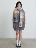 Drift through the winter season in this **Oversized Fluffy Plaid Scarf**. Featuring a gentle palette of soft powder blue, warm beige, and creamy white, this scarf captures the essence of the "Soft Scandi" and "Pastel Academia" aesthetics. It looks effortless paired with a white puffer jacket or a classic camel coat, adding a touch of sweetness to cold days.