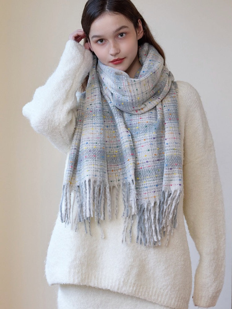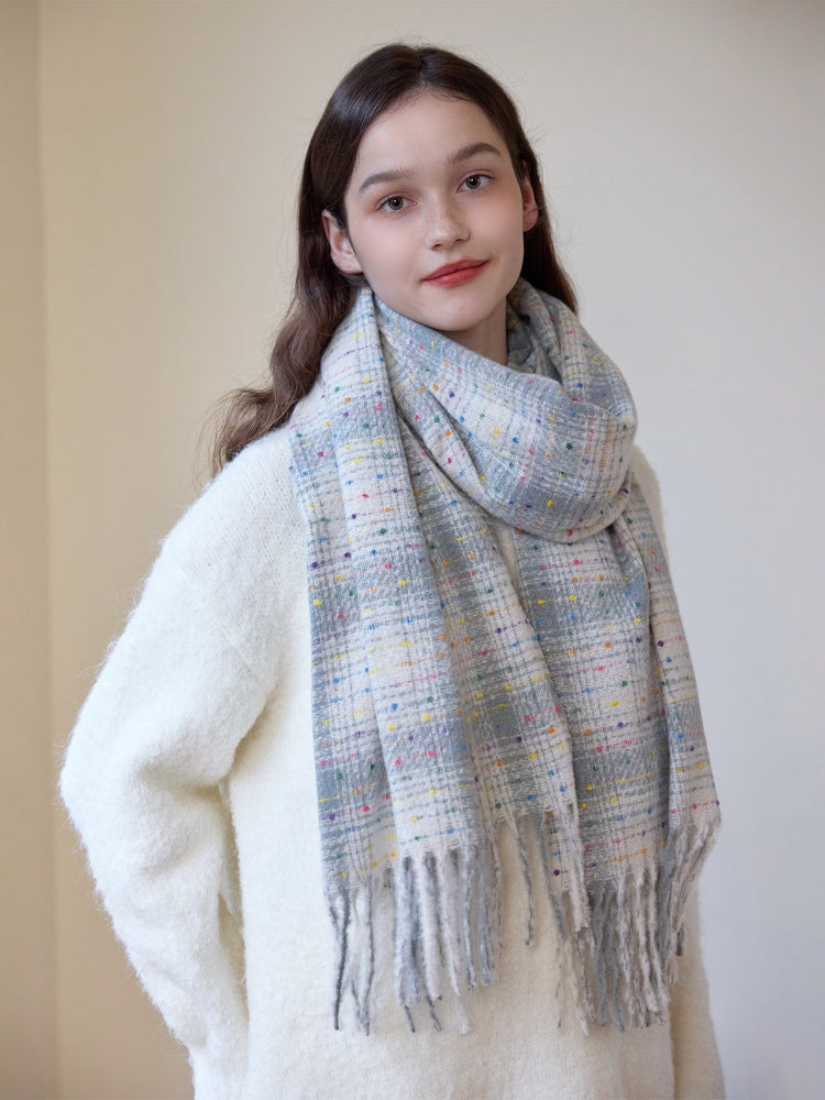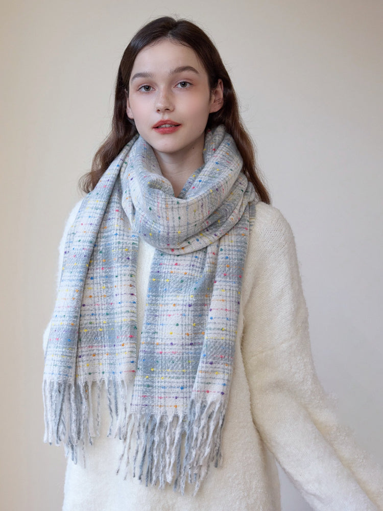 Brighten up the greyest winter days with our Oversized Grey Confetti Scarf. Inspired by the "Galaxy Sugar Bean" trend, this charming accessory features a soft dove-grey base sprinkled with multicolored rainbow speckles, creating a playful yet sophisticated "confetti knit" look.