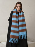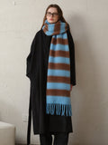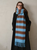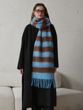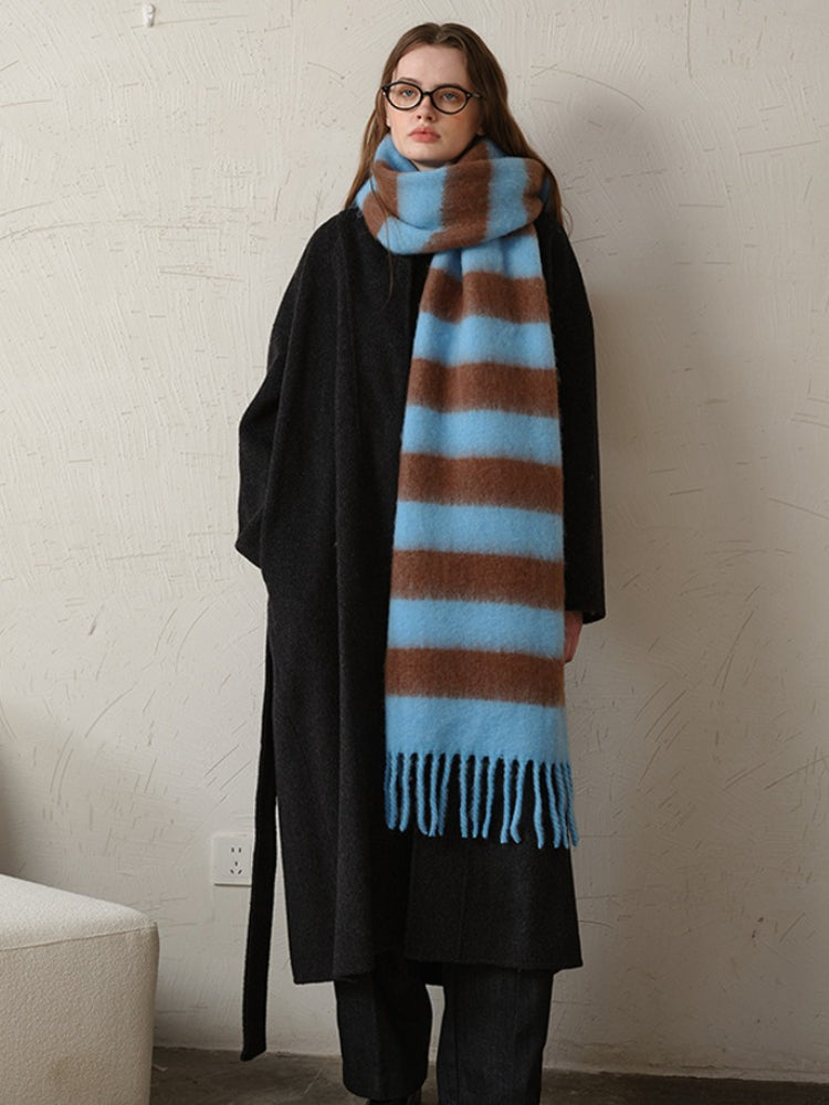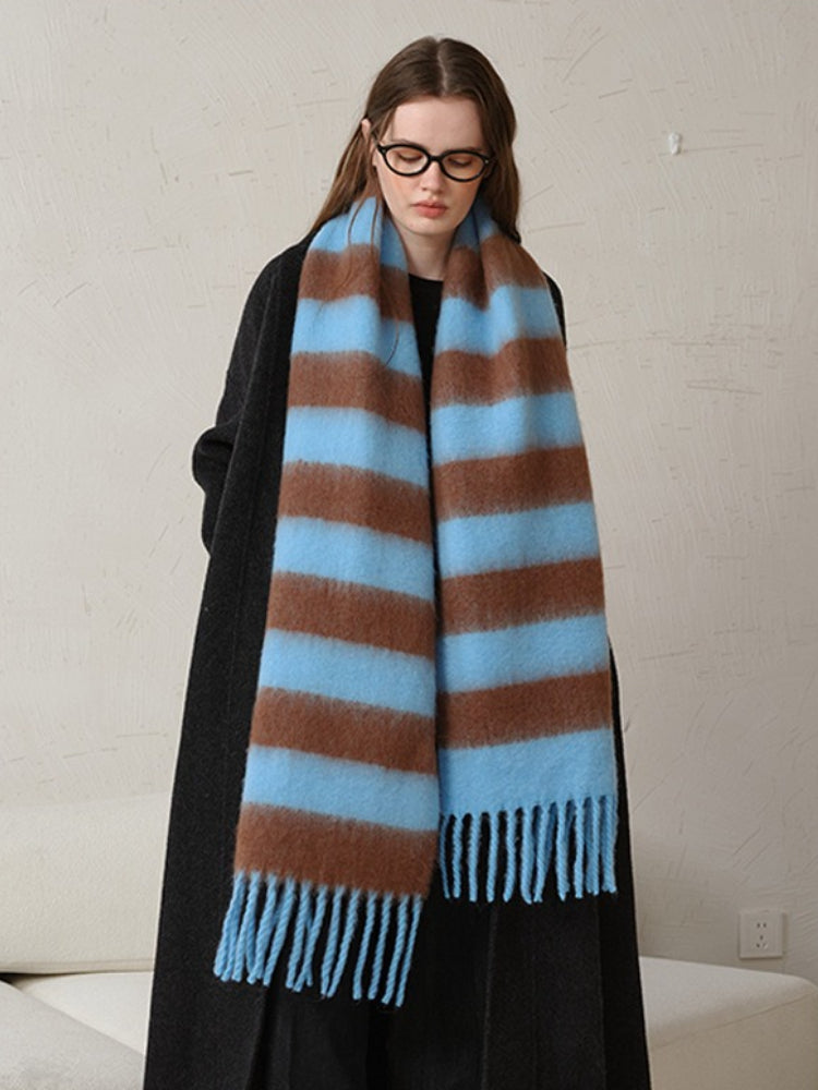 Make a statement without saying a word with our Oversized Fuzzy Wide Stripe Scarf. Combining a retro Preppy aesthetic with modern streetwear vibes, this accessory features bold, wide "rugby stripes" in a trending blue and brown colorway that instantly updates any winter coat.
