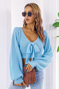 Step into a world of soft romance and "Coquette" charm with our Pastel Blue Bow Tie Crop Sweater. This piece is the ultimate embodiment of the "Balletcore" aesthetic, featuring a dreamy baby blue hue that brightens up the gloomiest autumn days. The focal point is the dramatic, self-tie bow at the chest—a playful yet elegant detail that frames the deep V-neckline beautifully.