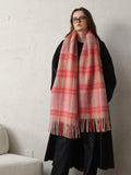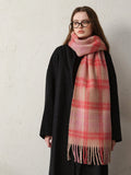 Elevate your winter wardrobe with this stunning **Pink Plaid Wool Blend Scarf**. Featuring a harmonious blend of soft blush pink, warm beige, and strawberry red checks, this scarf perfectly captures the "Romantic Academia" and "Barbiecore" trends. It adds an instant flush of color to neutral coats, making you look vibrant and cozy even in the snow.