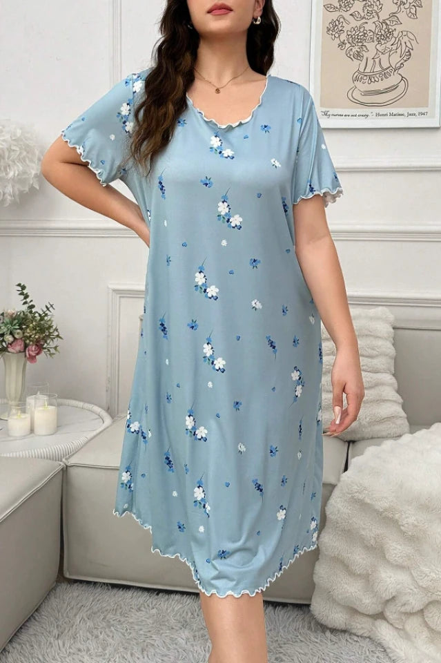 Plus Size Blue Floral Print Nightgown with Lettuce Trim, Short Sleeve Midi Sleep Dress - Soft Loungewear
