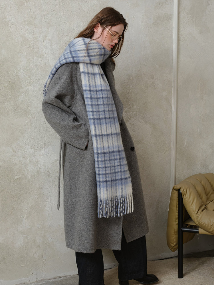 Elevate your winter silhouette with this Premium 30% Wool Blend Plaid Scarf. Channeling the intellectual charm of the "Soft Academia" aesthetic, this scarf features a serene blue and grey tartan pattern that pairs flawlessly with wool coats, trench coats, and oversized blazers.