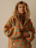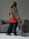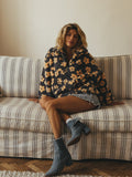Crafted from ultra-plush, high-pile sherpa fleece, it features a whimsical yellow daisy pattern set against a charcoal grey backdrop. The relaxed, oversized silhouette and versatile half-zip collar allow for easy layering over turtlenecks or thermals. Whether you're heading out for a crisp morning coffee run or curling up by the fireplace, this sweatshirt feels like a warm hug you can wear.