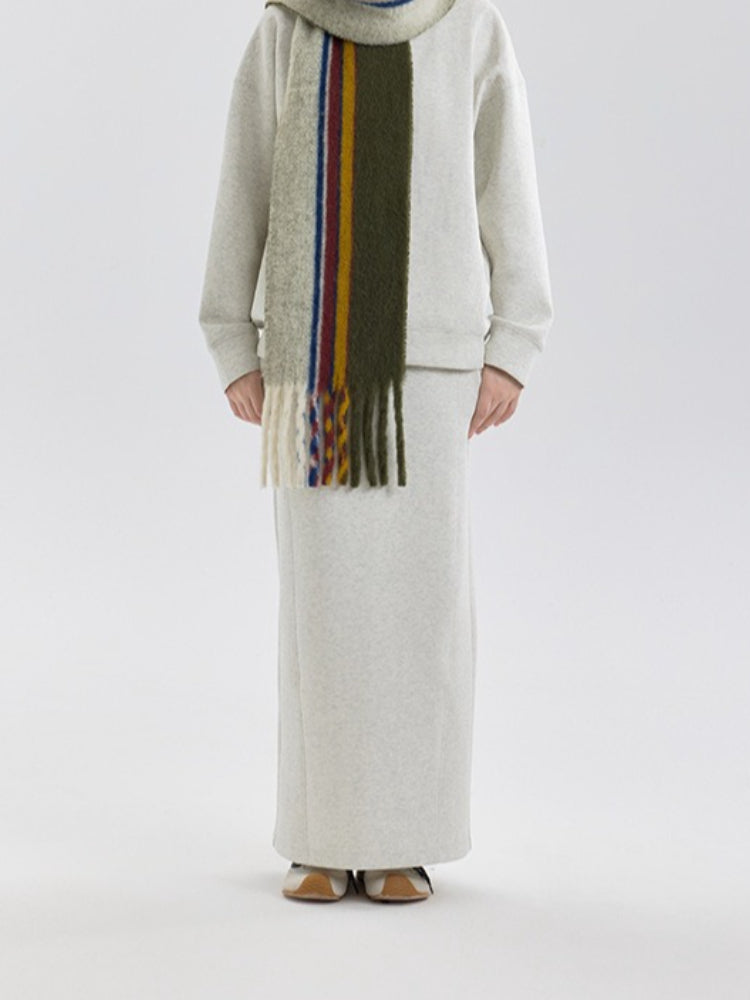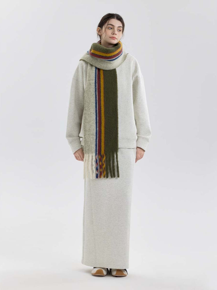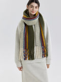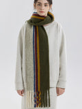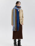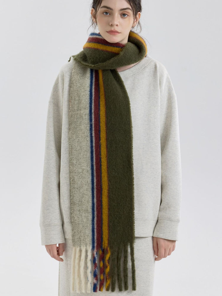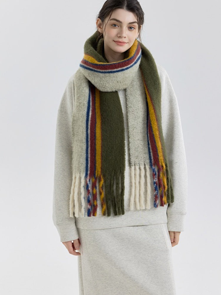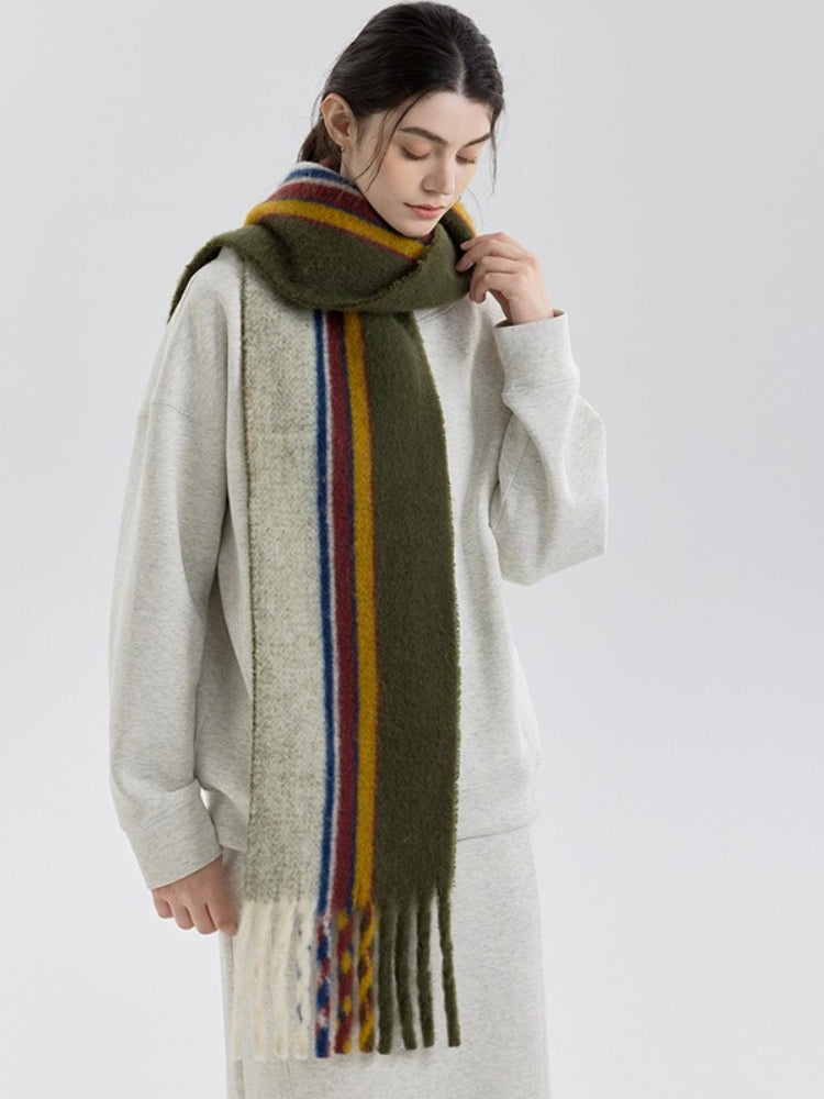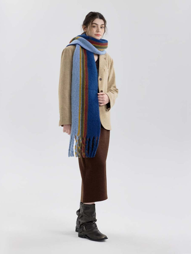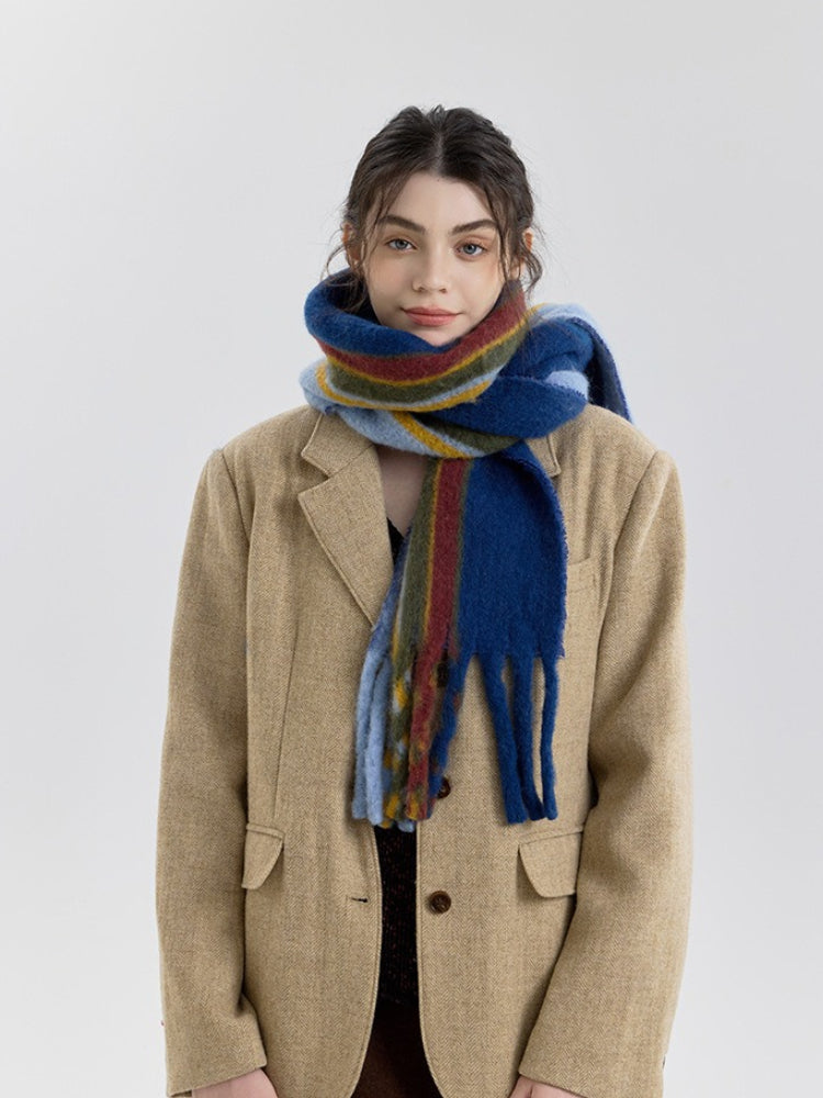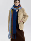 Capture the essence of the classic "Old Money" and Retro Academia aesthetics with this stunning Vintage Striped Wool Blend Scarf. Featuring a bold yet harmonious color block design in muted blues, earth tones, and mustard yellows, this scarf brings a sophisticated pop of color to any neutral winter coat.