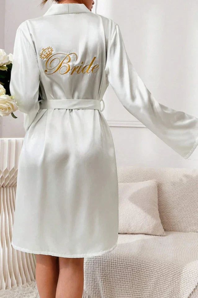 Crafted from silky-smooth white satin, the robe features exquisite gold embroidery on the back spelling "Bride," topped with a regal crown detail. The classic kimono style comes with wide sleeves, an inner tie for security, and a matching outer sash belt to cinch the waist. Lightweight and photogenic, it is a must-have essential for your big day or a thoughtful gift for a bridal shower.