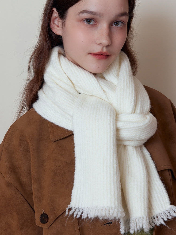 Woven from a soft Wool Blend, this scarf features a timeless vertical ribbed knit that offers natural elasticity and warmth. Weighing in at 7.4 oz (209g), it hits the "Goldilocks" zone of winter accessories—substantial enough to keep you warm, yet light enough to drape comfortably indoors. The creamy white hue pairs flawlessly with camel coats, leather jackets, or denim for a sophisticated, daily look.